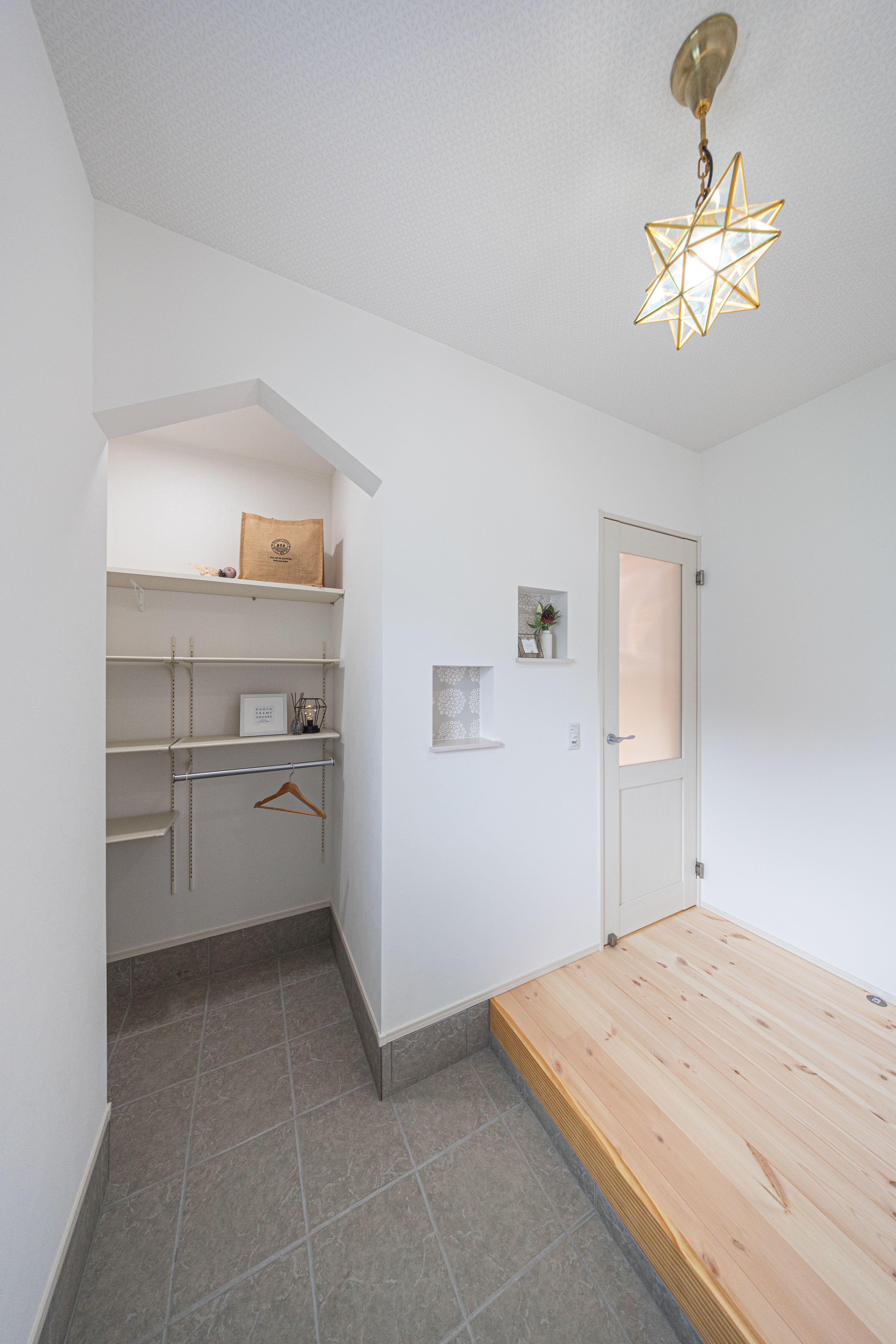 ニッチは一面だけ壁紙を柄物にしてアクセントを。小物を置いても置かなくてもサマになります。