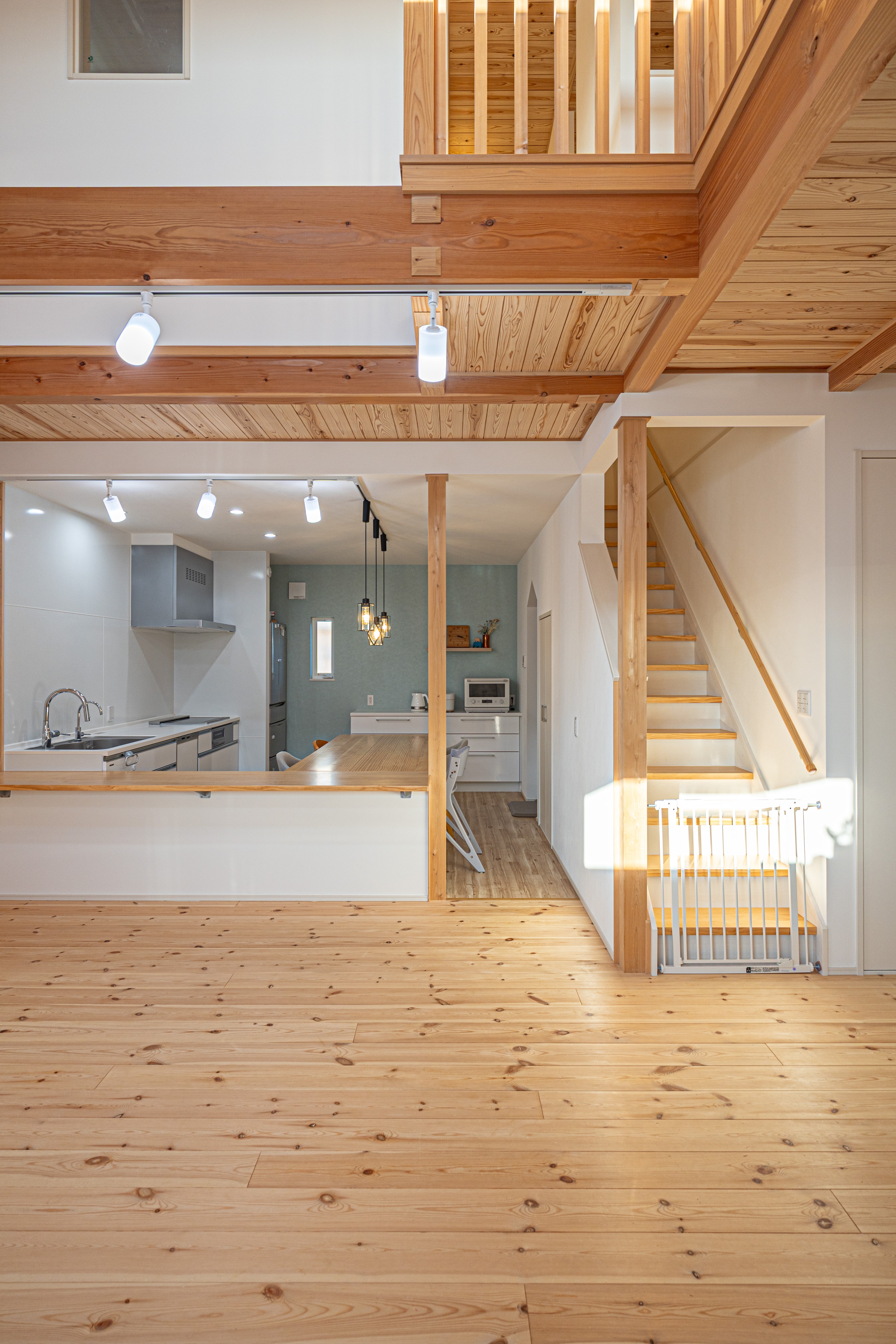 ひと味違う家を!とご主人の一声がきっかけで、ご提案させていただいたのは、リビングからの吹き抜けと一体となった2階が廊下を回遊するという間取りです。L字型のカウンターテーブルがあるオープンなキッチンや吹き抜けなどご要望いただきました。さらに、家全体に無垢の木をたっぷりと使用し、自然光もしっかり取り込みながら外を気にすることなく癒しの時間を存分に過ごしていただける家となりました。