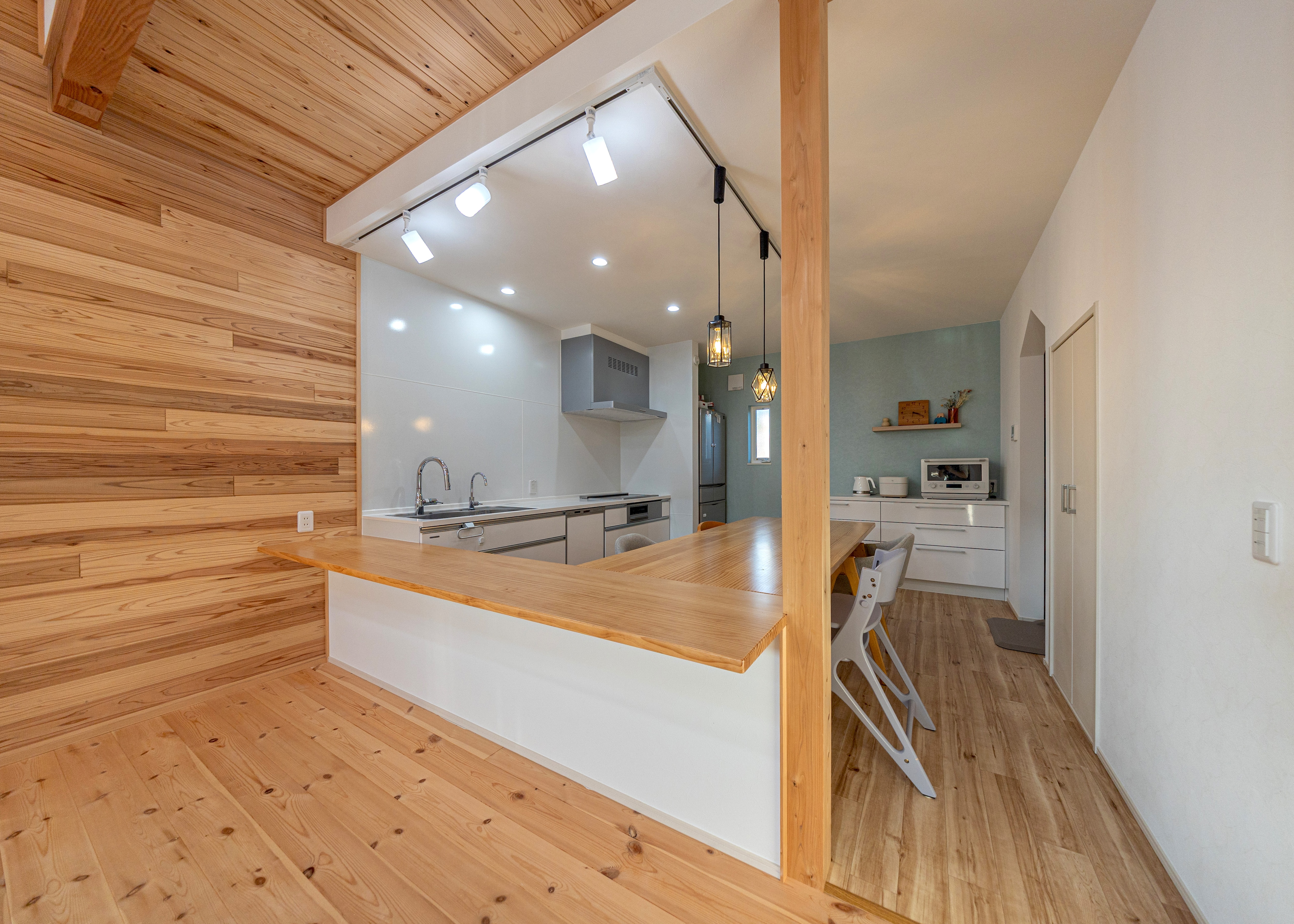 壁付けキッチンを囲むようにダイニングカウンターを造作。家事が楽な上に、リビングからの眺めも雰囲気があり抜群。