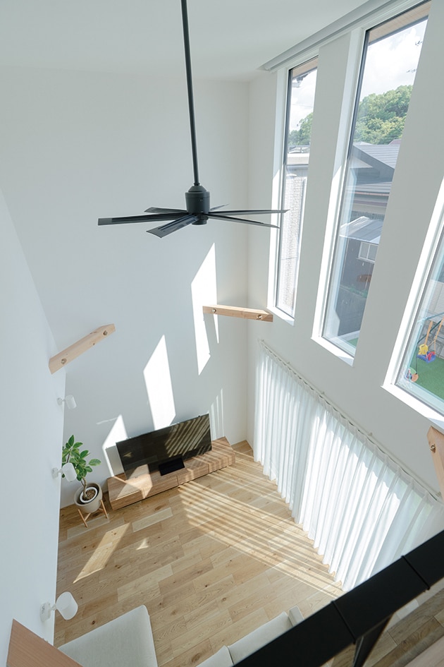 吹き抜けから降り注ぐやわらかい光が家族を包むリビングは居心地バツグン!