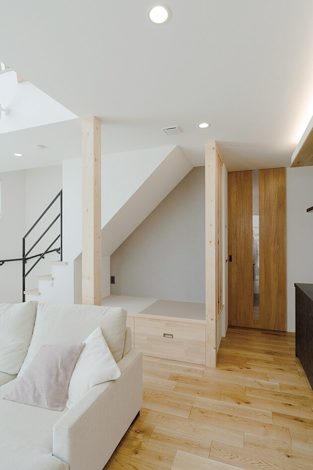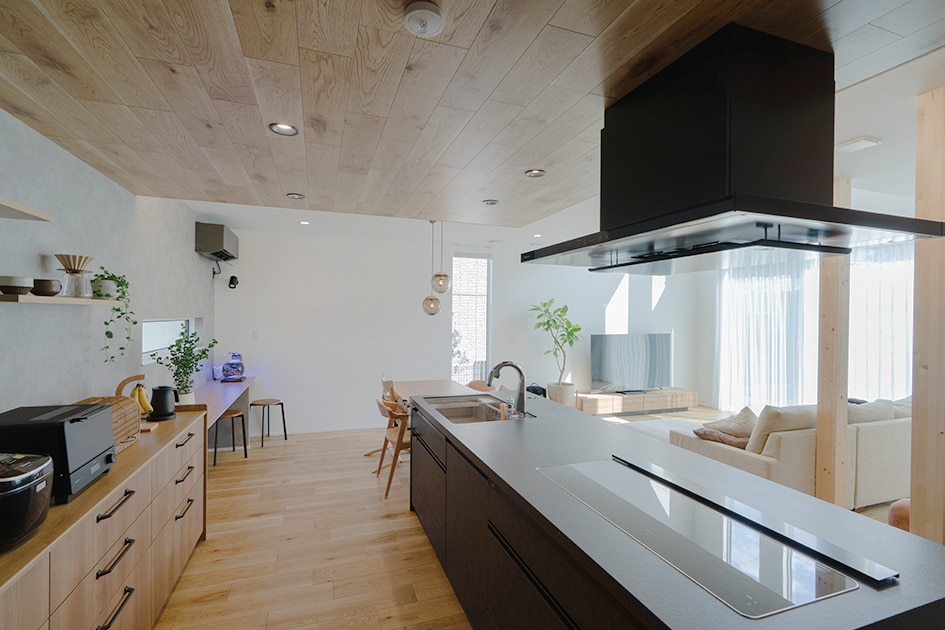 全体的に白とナチュラルカラーと空間を引き締める黒で、ご要望のあった統一感のあるカラーコーディネイトを実現しました。キッチンの下げ天井を床と同じ色にするなどの提案をさせていただきました。